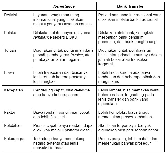 • Perbedaan Remittance dan Bank Transfer. Remittance dilakukan melalui penyedia layanan khusus (seperti DOKU) dengan proses cepat dan biaya lebih transparan/rendah, cocok untuk transaksi pribadi atau pembayaran invoice antar negara. Sementara itu, bank transfer dilakukan melalui sistem perbankan tradisional (melibatkan SWIFT), cenderung lebih lambat, biaya lebih tinggi, dan sering dipilih untuk transaksi formal atau korporat dalam jumlah besar.