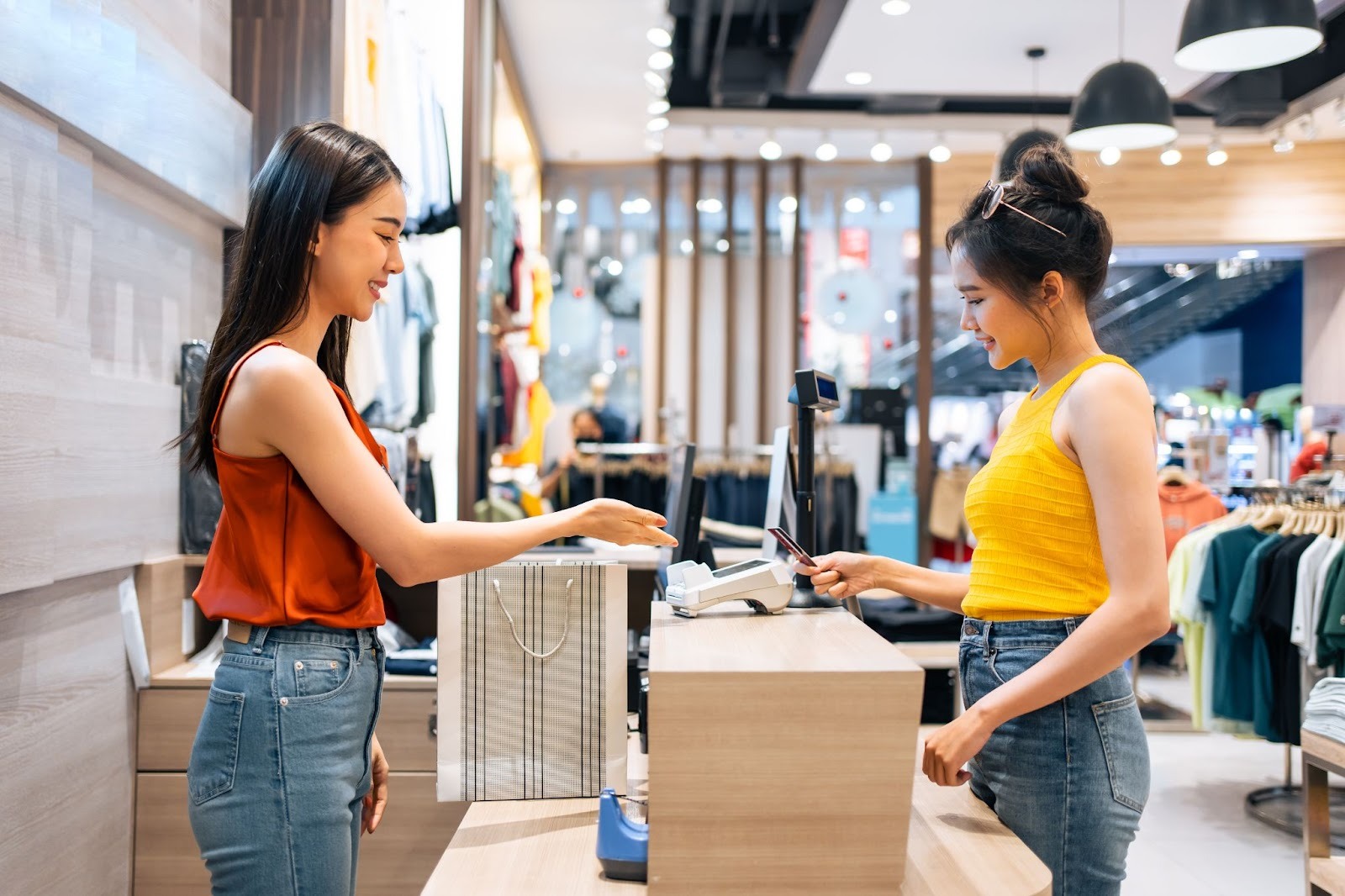 Pasangan muda berbelanja pakaian di toko ritel, menggambarkan peluang bisnis ritel modern dengan solusi pembayaran digital dari DOKU Payment Gateway.
