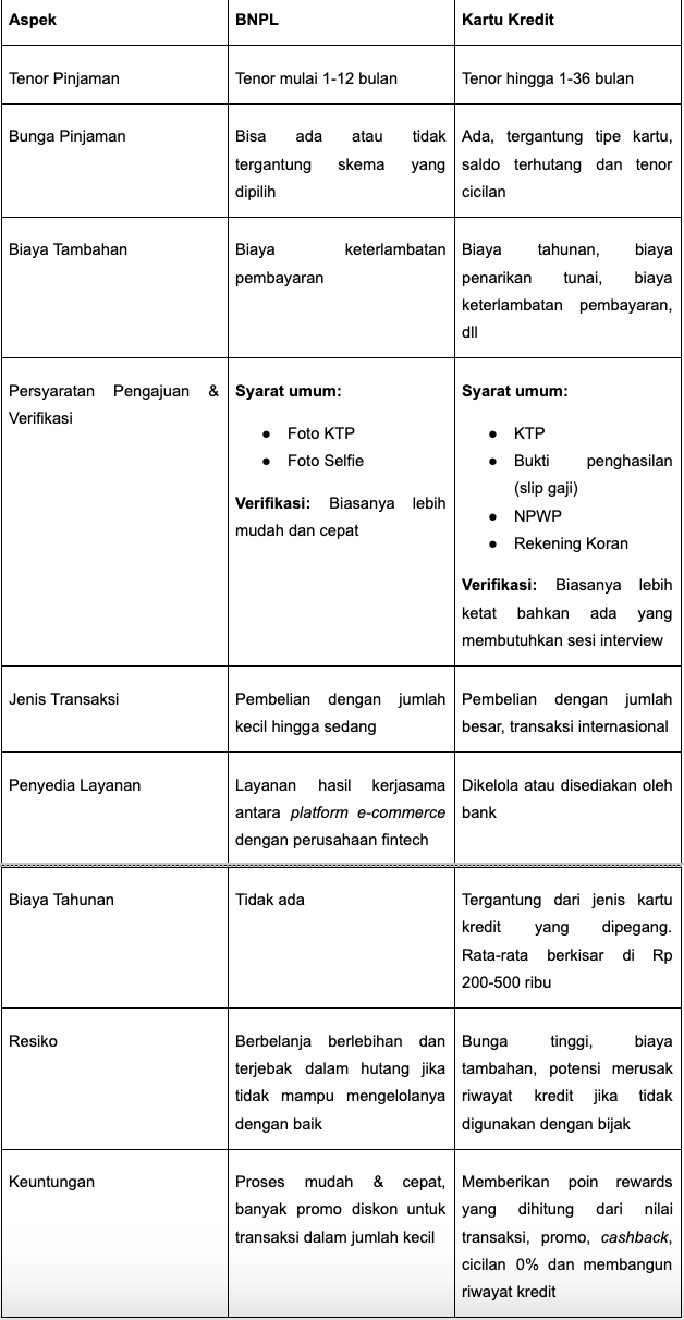 Berikut perbedaan karakteristik BNPL dan Kartu Kredit: