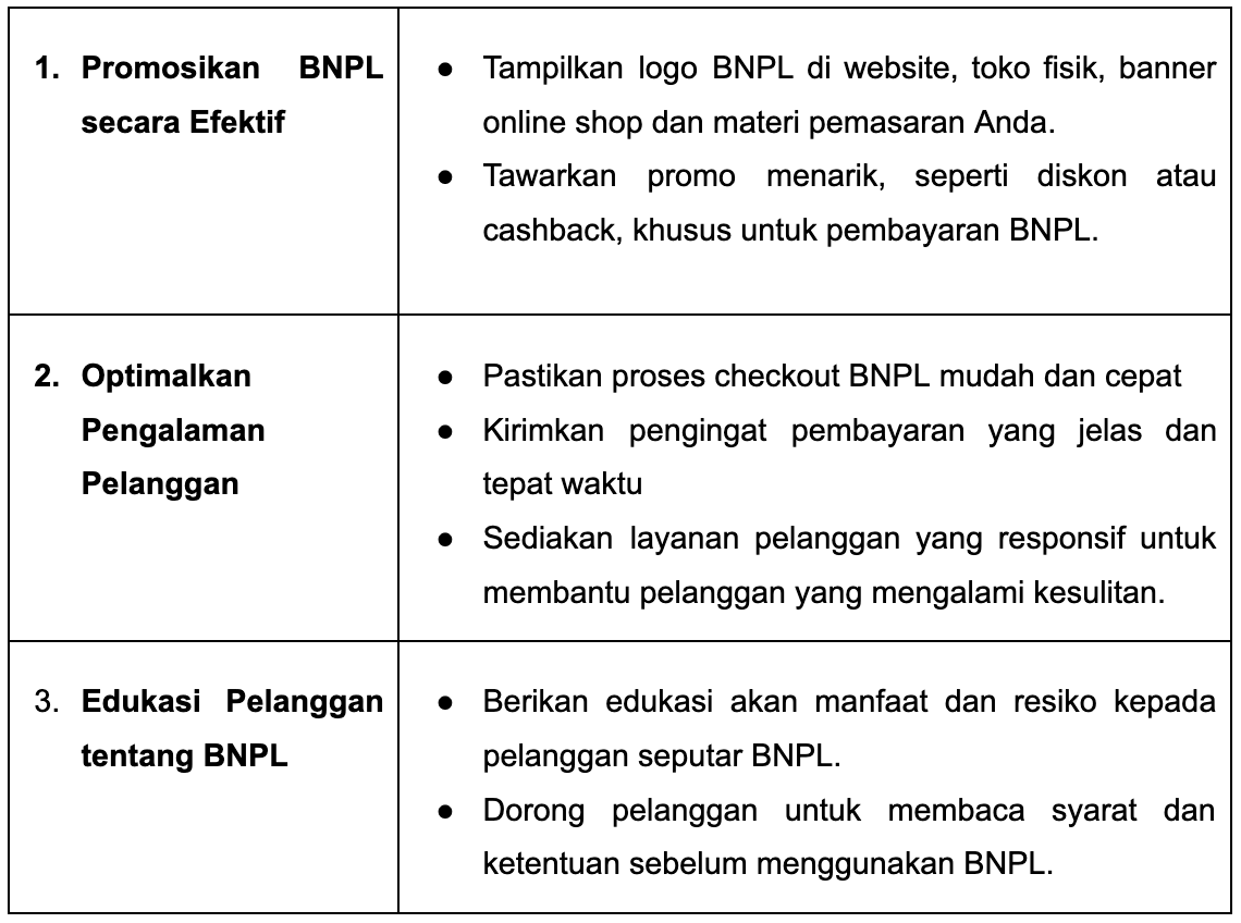 Dengan menawarkan opsi pembayaran BNPL atau pay later, pebisnis dapat memperluas basis pelanggan mereka dan meningkatkan penetrasi pasar. Untuk lebih lengkapnya informasi tentang BNPL, simak ulasannya dibawah ini: